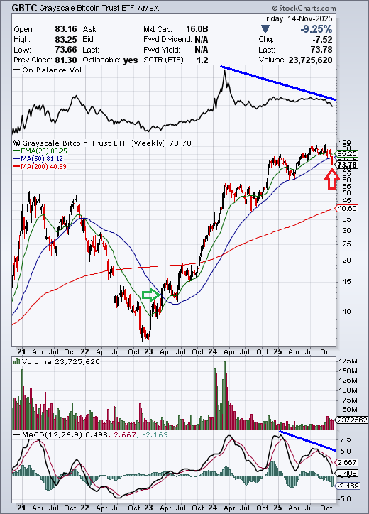 In der vergangenen Woche wurde nun möglicherweise der Startschuss zu einer ausgewachsenen Bitcoin-Baisse abgefeuert: Erstmals seit fast drei Jahren ist der US-amerikanische Bitcoin-ETF mit dem Kürzel GBTC unter seinen gleitenden 50-Wochen-Durchschnitt gestürzt. Achten Sie auf die blaue Linie in der folgenden Grafik (roter Pfeil):