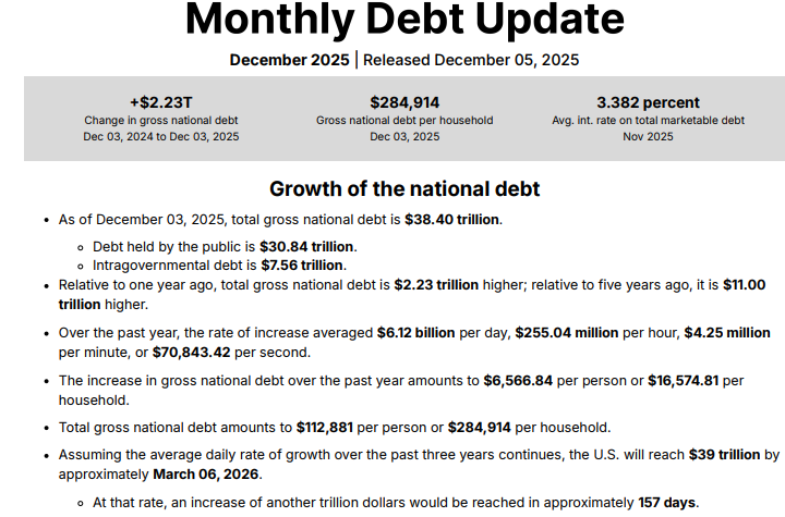 Seit Anbeginn der Zeit bis heute hat es in jedem Fall – sowohl theoretisch als auch empirisch – zu einer Katastrophe geführt, wenn Regierungen mehr ausgeben als sie einnehmen. Auch dieses Mal wird die Fed einfach das Geld „drucken”, das sie braucht, um weiterhin über ihre Verhältnisse zu leben. Am 1. Dezember 2025 beendete die Fed ihre QT (quantitative Straffung … auch bekannt als Inflationsbekämpfung). Bald wird sie mit QE (quantitative Lockerung … auch bekannt als Inflation) beginnen.